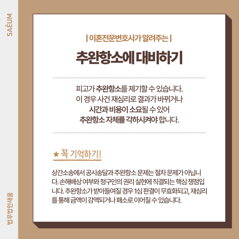 상간소송에서 공시송달과 추완항소 문제는 단순한 절차 문제가 아닙니다. 실제로 손해배상 여부와 청구인의 권리 실현에 직결되는 핵심 쟁점입니다. 특히 추완항소가 받아들여질 경우 1심 판결이 무효화되고, 재심리를 통해 금액이 감액되거나 패소로 이어질 수 있습니다. 따라서 상대방의 태도와 대응방식에 따라 소송의 방향이 완전히 달라질 수 있다는 점을 기억해야 합니다.