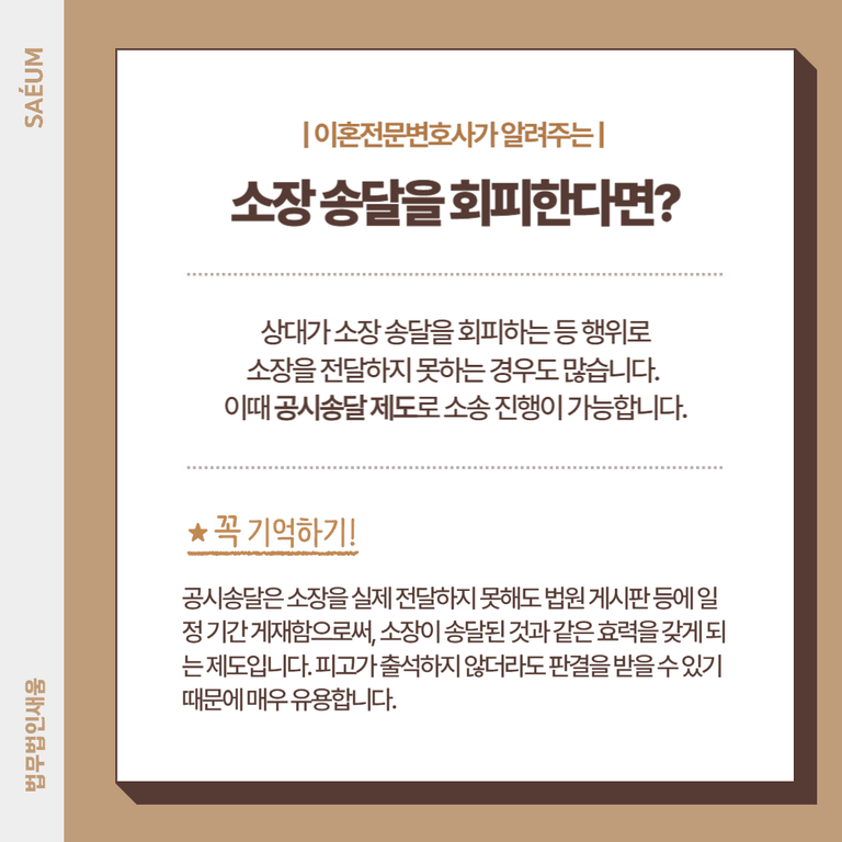 그 결과, A씨의 위자료 청구가 전액 인정되었고, 판결 역시 공시송달 절차를 통해 최종 확정되었습니다. 이후 B씨는 자신도 모르게 소송이 진행되었다며 추완항소를 제기했지만, 법무법인 새움은 B씨가 송달을 고의적으로 회피했다는 점을 객관적인 증거와 증인신문을 통해 입증했습니다. 특히 B씨가 지인에게 “소장을 피할 계획”이라는 취지의 발언을 했다는 점이 법정에서 확인되면서, 재판부는 B씨의 추완항소를 각하했고, A씨는 1심 판결을 그대로 유지하면서 소송비용까지 모두 상대방이 부담하도록 판결을 이끌어낼 수 있었습니다.