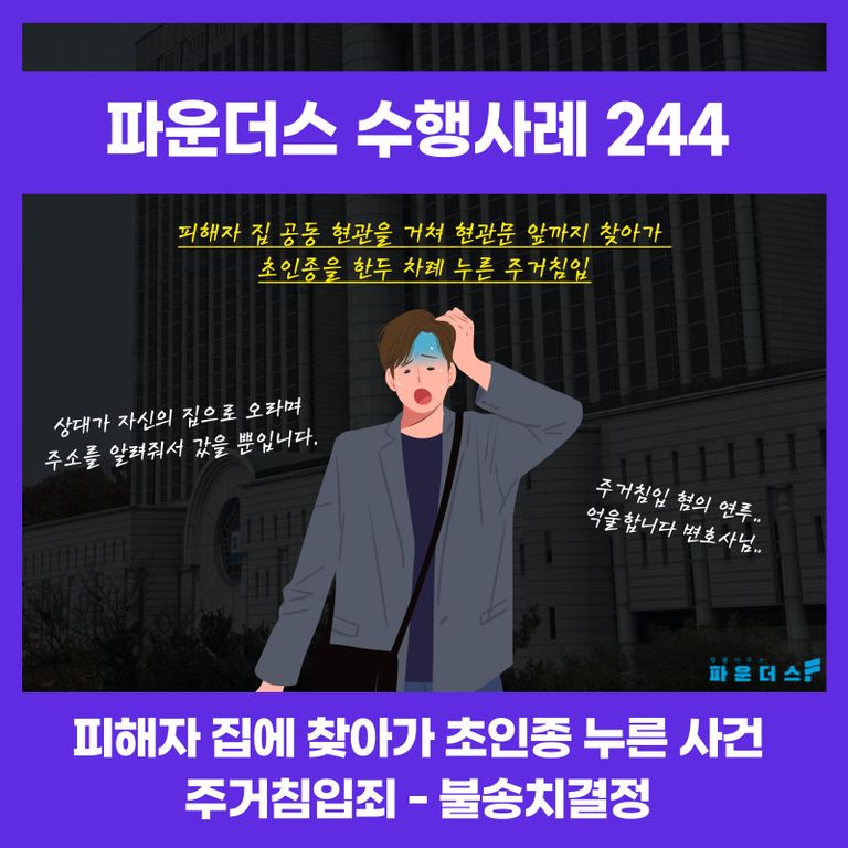 의뢰인은 공동현관 앞에 도착한 이후 고소인에 연락을 하였지만 답장이 없었고 마침 다른 입주민이 공동현관에 들어갈 때 함께 들어가게 되었으며 이후 현관문 앞에서 초인종을 두 차례 누른 것 이외에 어떠한 행위를 하지 않았다며 억울함을 호소했습니다.