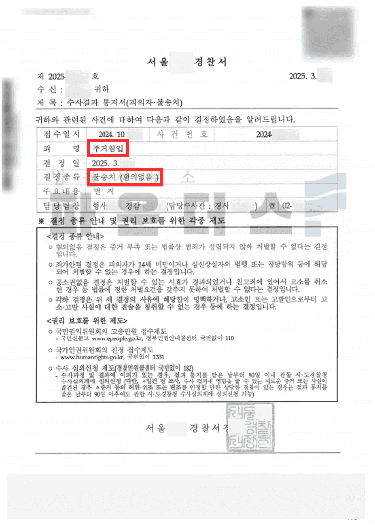 그 결과 의뢰인은 고소인의 집 공동현관에 허락없이 들어갔고 현관문 앞 초인종을 한두 차례 누름으로써 문제가 된 주거침입 사건에 있어 불송치결정(혐의없음)으로 경찰단계에서 조속히 마무리 지을 수 있었습니다.