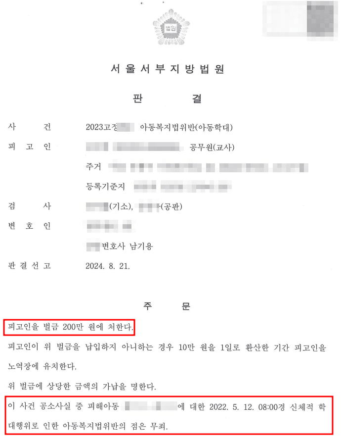 본 변호인은 의뢰인으로부터 피해를 당하였다고 주장하는 학급 아동 및 그 학부모, 다른 학급 아동에 대한 증인신문을 통하여 학급 아동 및 그 학부모의 주장은 CCTV 등 객관적인 증거로 현출된 실체적 진실과 다르고, 상당부분 과장되어 있으며, 교육적 목적에서 이루어진 행위라는 점을 강조하며 적극 변론하였습니다.