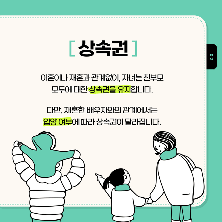 단, 부모가 재혼한 이후 새로운 배우자와의 관계에서는 입양 여부에 따라 상속권 유무가 갈립니다.