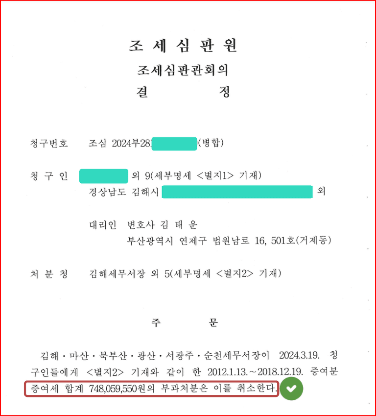 조세심판원은 “청구인들의 명의는 도용당한 것이며, 명의신탁 증여의제가 성립할 수 없다”는 결론을 내렸습니다. 총 7억 4천만원의 증여세가 전부 취소된 극적인 역전승이었습니다.