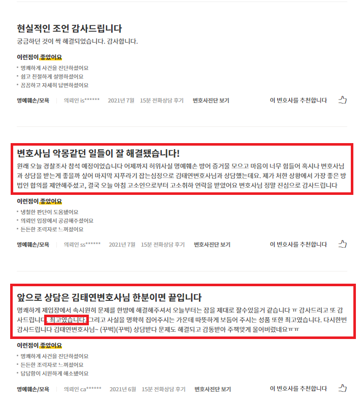 이미 진행된 다수의 법률상담 진행을 통해 그 신뢰도를 검증받은 김태연 대표변호사님, 관련해서 악플들을 모욕 및 명예훼손으로 고소 할 수 있을 지 상담을 진행한 의뢰인들이 남긴 후기를 소개합니다.