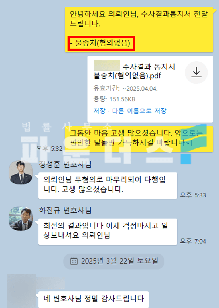 끝으로 변호인 의견서 작성을 통해 의뢰인의 입장이 원만히 받아들여질 수 있도록 세심한 조력을 드렸습니다.