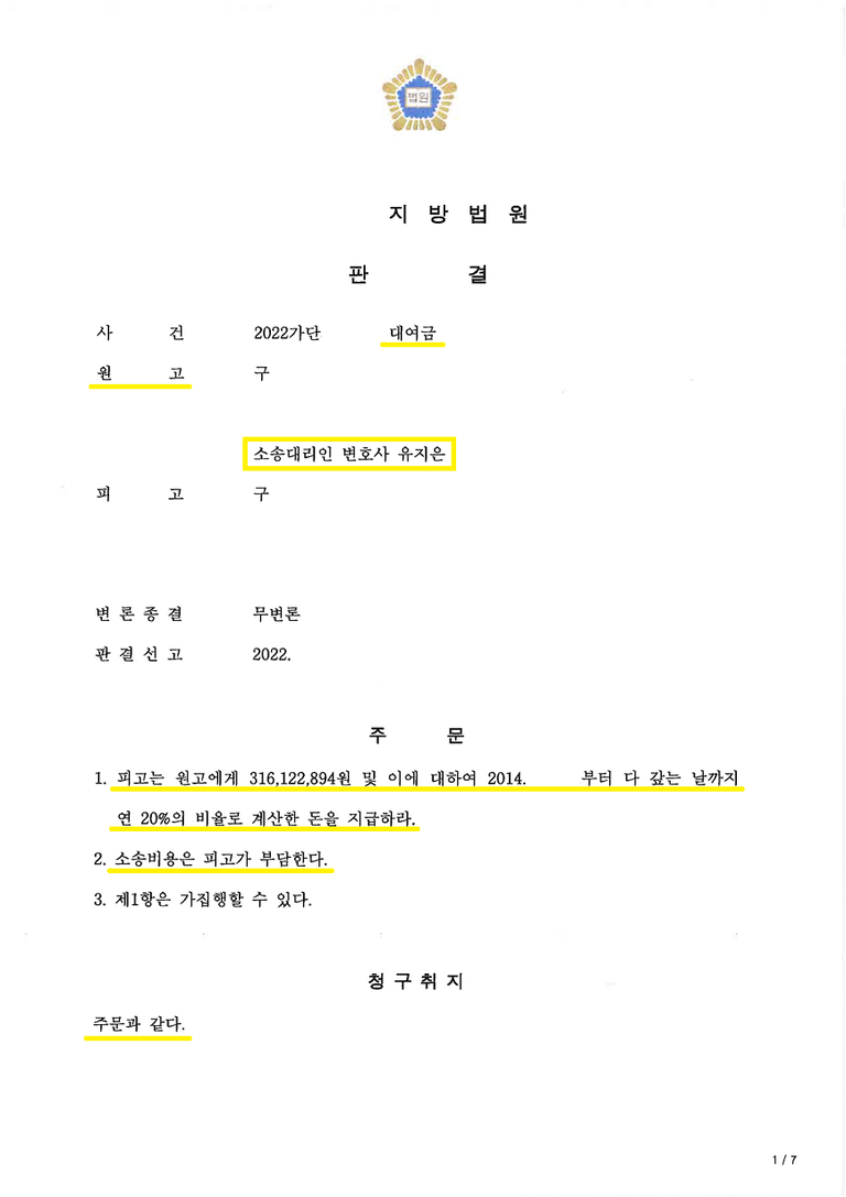 결국, 저희가 청구한 그대로 인정되어 의뢰인은 3억 이상의 대여금 뿐만 아니라 그 동안의 이자까지 전부 받아옴으로써 전부 승소한 사안입니다.