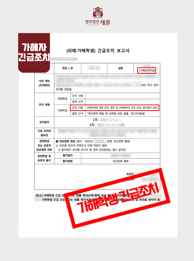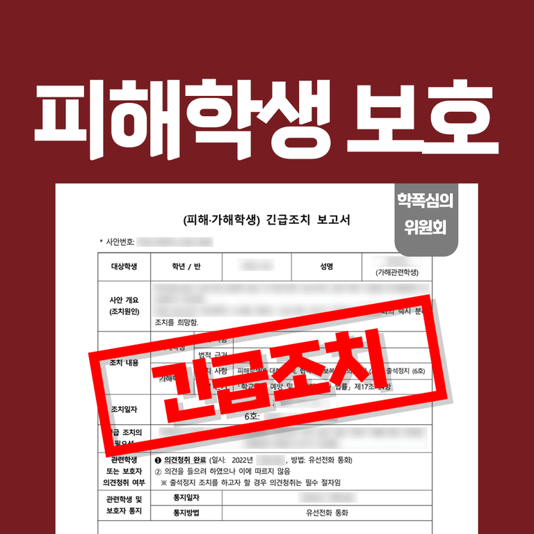 학교장이 사건을 인지한 경우 피해학생이 반대하는 등의 특별한 사정이 없는 한 지체 없이 가해학생과 피해학생을 분리하는 조치를 취하도록 하고 있습니다. 아울러 피해학생이 학교에 긴급보호를 요청하는 경우, 학교장은 법에서 정하고 있는 다음의 긴급조치를 내릴 수 있으며, 긴급조치를 내린 경우 즉시 학폭위에 보고해야 합니다.