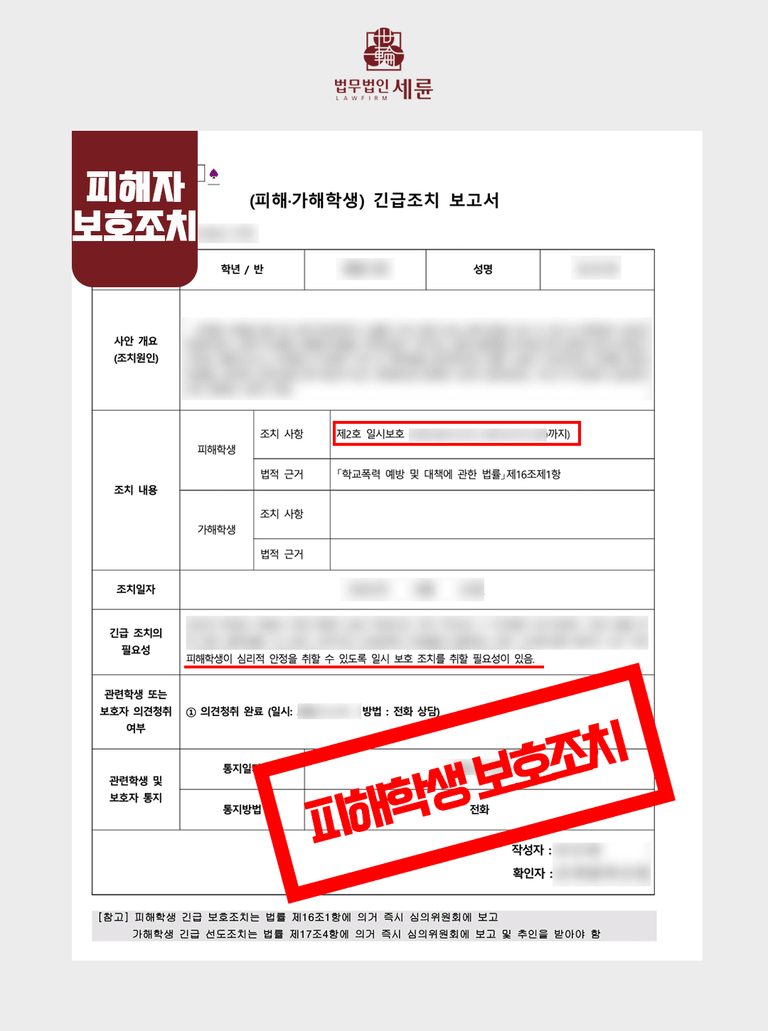 가해학생에 대한 조치뿐만 아니라 피해학생에 대한 조치는 굉장히 중요하며, 이와 같은 보호 조치는 매우 신속하게 이루어져야 합니다. 정신적으로 매우 힘든 상황임은 물론, 무섭고 두려운 마음에 불안정한 심리 상태에 놓여 있는 경우가 많기에 세심하게 배려하여 필요한 조치를 빠르게 취하는 것이 좋으며, 즉각적인 분리 조치는 2차 학폭 피해를 예방하고 갈등이 심화되는 것을 방지할 수 있기에 반드시 필요한 조치라 할 수 있겠습니다.