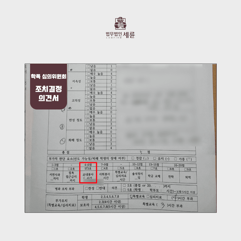 신체 폭행, 언어 폭행으로 학폭신고 접수되었던 오늘 사례는 남학생이 여학생의 뺨을 때리고 이로 인해 여학생이 전치 2주 진단을 받은 것으로 학교폭력 행위가 심각하다고 판단된 사안이었습니다. 한편, 가해행위의 지속성, 고의성 부분에서 낮은 점수를 받았고 확인서를 토대로 반성 정도와 화해 정도가 높다고 인정되어, 3호 교내봉사 처분과 3시간 특별교육 부가조치 내려졌습니다.