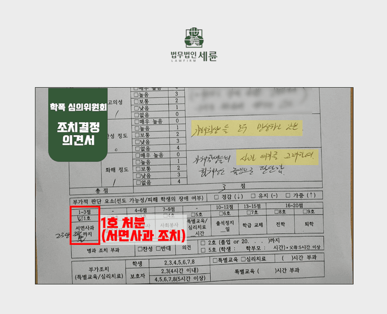 그리고 가해학생들에 대해서는 1호 처분(서면사과)을 내렸는데요, 학교폭력심의위원회는 친구들 간 오해에서 비롯되어 사과강요, 욕설 등이 이루어진 상황이므로 심각성과 고의성은 낮은 편이라고 판단하였고, 가해학생들이 모두 반성하고 있고 화해 의지를 보이고 있어 이를 참작하여 점수를 줬습니다.