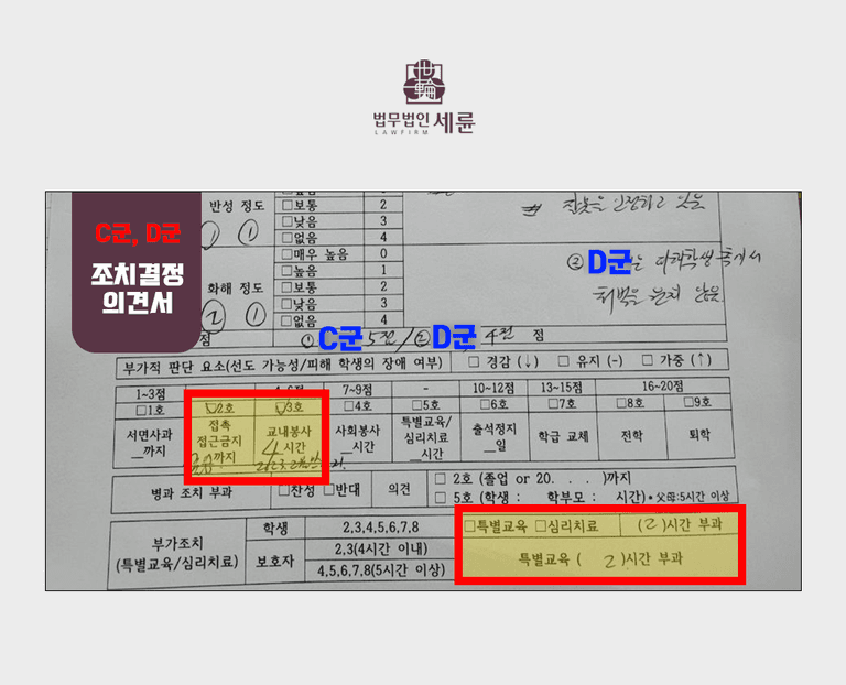 C군과 D군은 학폭 위력에 일부 가세하거나 행위를 방조했기 때문에 학폭 처분을 피할 수 없었습니다. C군은 실제로 신체폭력을 가했기 때문에 선도조치 결정 사항에 있어 총 5점을 받아 2호 조치(접근금지)와 3호 조치(교내봉사 4시간)가 이루어졌고, 학폭을 방관했던 D군은 피해학생 측에서 처벌을 원치 않았기에 총점은 더 낮았지만 C군과 같은 처벌을 받았습니다. 그리고 두학생에게 모두 부가조치로 학생과 보호자 대상으로 특별교육 2시간 또한 부과되었습니다.