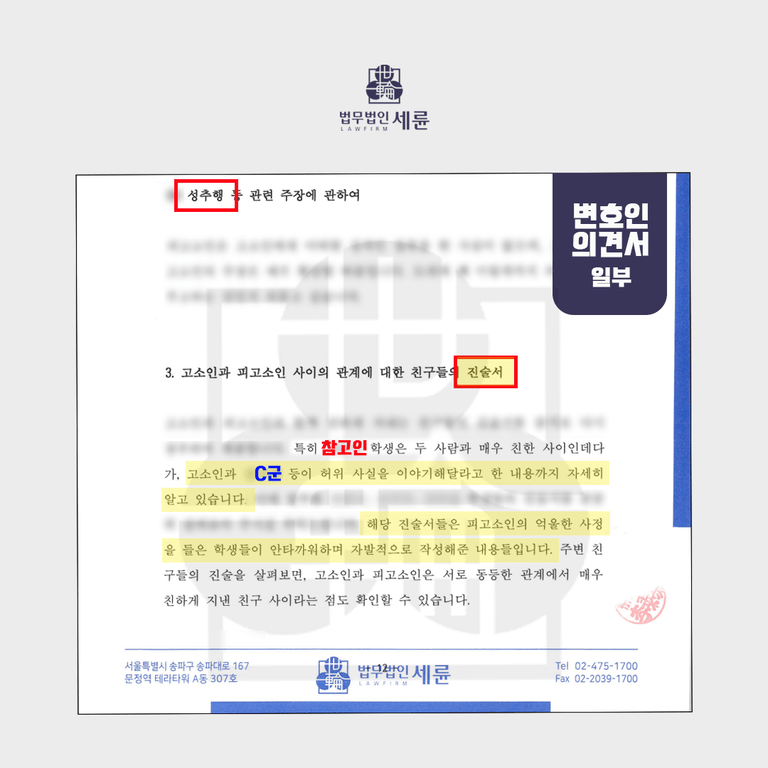 게다가 다른 사건과의 연관성을 주장했는데요, 평소 A군에게 악감정을 가지고 있던 소위 일진인 C군이 자신의 위력을 활용하여, B군에게 A군에 대한 허위 학폭신고를 종용한 것임을 주장했습니다. 이를 입증하기 위해 친구들에게 참고인 진술서를 받아 활용하였고, 이외에도 둘 간에 메신저 대화 내용과 입금내역 등의 증거 자료를 통해 B군의 주장에 신빙성이 떨어진다는 점을 변호인 의견서에 피력하여 제출하였습니다.