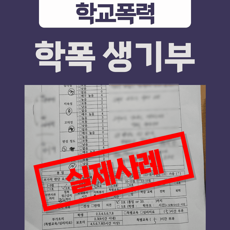 하지만 4호부터는 다릅니다. 4호 이상의 처분을 받게 될 경우 학폭생기부에 기록되고 졸업 후 2년에서 4년 동안은 삭제가 불가능한데요, 2026년도 대입부터는 생활기록부에 학교폭력에 대한 내용을 기재하는 것이 의무화되어, 4호 이상의 처분은 입시에서 감점, 자격 박탈 등의 직접적인 요인이 됩니다.