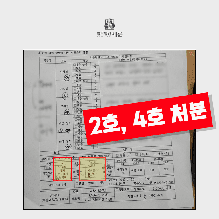 사례의 가해학생도 4호 처분을 받았기 때문에 학교폭력 사실이 생활기록부에 기록되는 것을 피할 수 없었습니다. 학교폭력생활기록부기재 되지 않으려면 잘못이 없다는 것을 적극적으로 입증하거나 3호 이하의 처분을 받을 수 있도록 해야합니다.