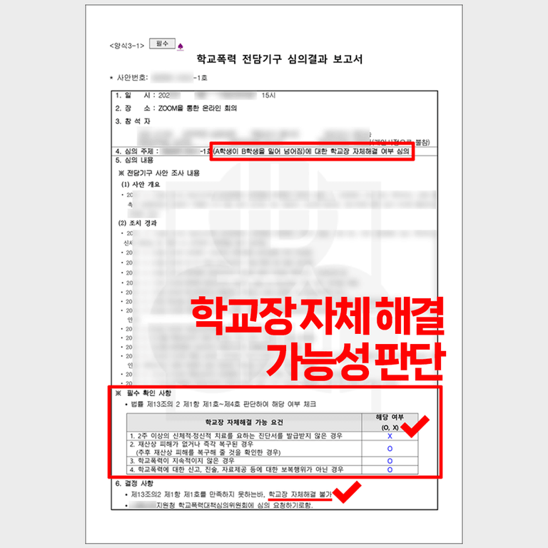 전치 2주 이상의 진단서를 제출하면 이는 학교장 자체해결 가능 요건에 해당하지 않게 되는데요. 이 경우, 사건은 자동으로 교육청 학폭위로 넘어갑니다. 그만큼 해당 사안은 교육청에서 심각한 사안으로 받아들여지고 있다는 것을 뜻하는데요. 따라서 전치2주 학교폭력 사안에 연루되어 학폭위 징계 위기라면 더욱더 철저하게 준비하여 대응할 필요가 있고 가능하다면 전문적인 조력을 받는 것이 현명한 방법입니다.