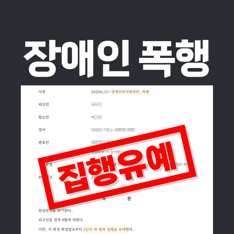 법원은 실제 장애인폭행죄 혐의를 받고 있는 자에게 집행유예 판결을 내린 사례에서, "피고인이 장애인임을 알면서도 폭행한 점은 죄질이 좋지 않으나, 초범인 점, 진지하게 반성하는 점, 피해자와 합의한 점 등을 고려하여 징역 8월에 집행유예 2년을 선고한다" 라고 설시하였습니다.