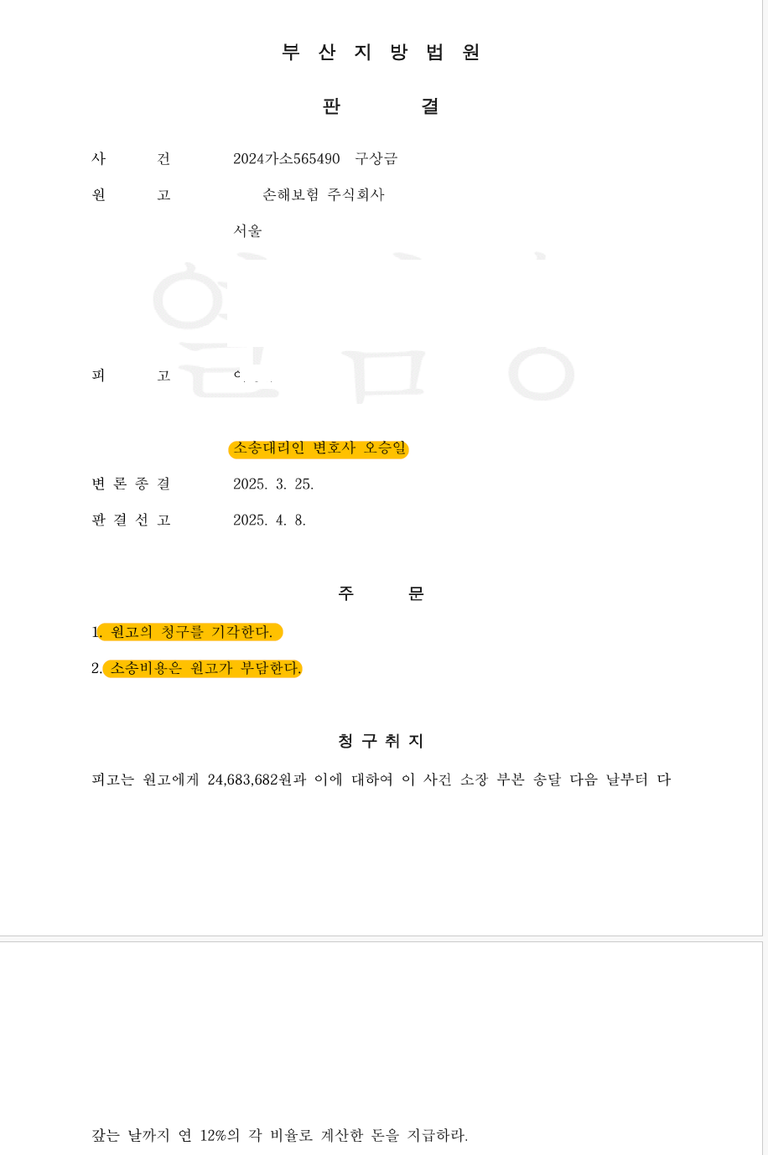그 결과 재판부는 오승일 변호사의 주장을 모두 받아들여 피해자 보험사의 구상금 청구를 전부 기각하였습니다.