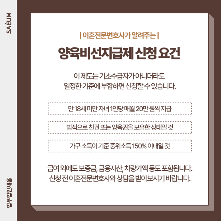 양육비 문제는 단순한 금전 문제가 아니라 아이의 미래와 직결되는 중요한 사안입니다. 만일 이혼을 앞두고 있거나, 이혼 이후 양육비 지급이 원활하지 않다면 반드시 제도를 활용하고 법적 대응을 준비해야 합니다. 양육비선지급제도는 사각지대를 메워줄 수 있는 현실적인 제도이지만, 신청 절차와 자격 요건이 복잡할 수 있습니다.