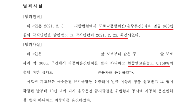 A씨는 2021. 2. 23. 음주운전으로 벌금 900만 원의 약식명령이 확정되었습니다.