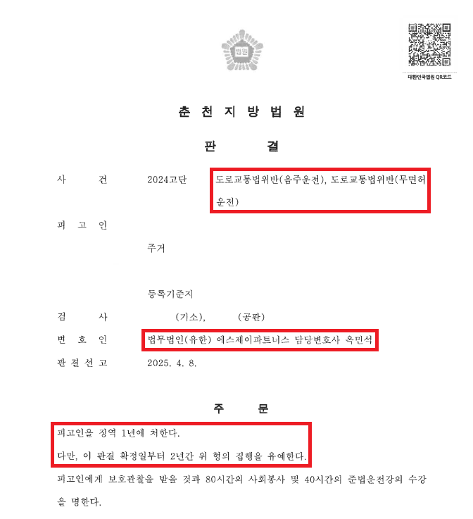 이러한 저의 조력을 바탕으로 A씨는 이미 음주운전 전력이 있을 뿐만 아니라 무면허에 혈중알콜농도도 0.158%로 매우 높았고, 특히 교통사고를 일으키고도 수습하기는커녕 음주운전을 은폐하기 위해 곧바로 주변 편의점으로 가 소주를 구매하여 추가로 음주를 하였음에도 불구하고 집행유예를 받음으로써 구속 위기에서 벗어날 수 있었습니다.