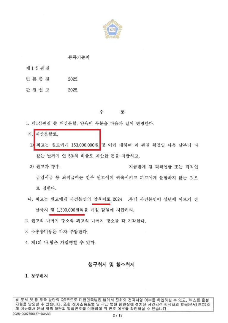 재산분할 1억 5천여 원 지급, 친권 및 양육권을 원고로 지정하였으며,