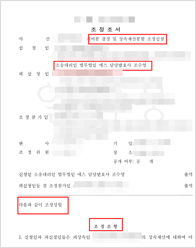 자칫하면 별건으로 수많은 민사소송 및 기여분심판청구를 추가로 제기해야할 정도로 논쟁이 길어질 수 있는 사건이었으나, 6개월 만에 조정을 통해서 만족할 만한 결과를 이끌어 낼 수 있었습니다.