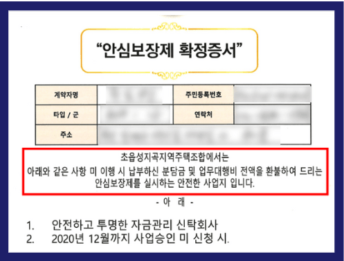 해당 조합은 초기 계약 시점에 조합원들에게 “2020년 12월까지 사업승인을 신청하지 않을 경우 분담금과 업무대행비를 전액 환불한다”는 취지의 <안심보장제 확정증서>를 아래와 같이 발급했습니다. 하지만 이 문서는 총회 결의 등의 필수 절차 없이 작성된 것으로, 법원에서는 이미 위법한 내용으로 판단해왔습니다. 따라서 해당 증서를 받은 경우, 이는 법적 효력이 없는 문서로 간주되어, 기망을 이유로 계약을 취소하고 납입금 반환을 청구할 수 있는 정당한 사유가 됩니다.