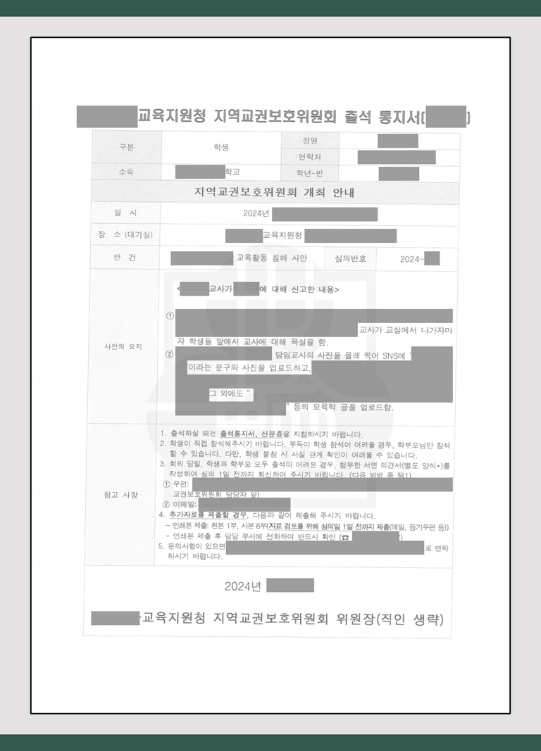 보통은 공식적인 안내 통지서를 받기 전에 학교를 통해 교권보호위원회로 넘어간다는 이야기를 듣게 됩니다. 사전에 심의를 준비하고 대책을 마련해야 하므로, 교권보호위원회로 회부되었다는 이야기를 들으시면 곧바로 전문 변호사와 이야기를 나눠보시는 것이 좋은데요. 늦어도 교육청으로부터 출석통지서를 받으시면 지체 없이 강동송파변호사와 같은 전문가의 조언을 들으시는 것이 필요합니다.