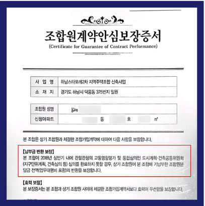 지역주택조합의 특성상, 이러한 전액 환불 약정은 총회 결의 절차를 거친 후에 발급되어야 하는데, 하남스타포레2차를 비롯한 많은 조합들이 이 절차를 무시하고 문서를 교부하여 계약 가입을 유도한 경우가 많습니다.