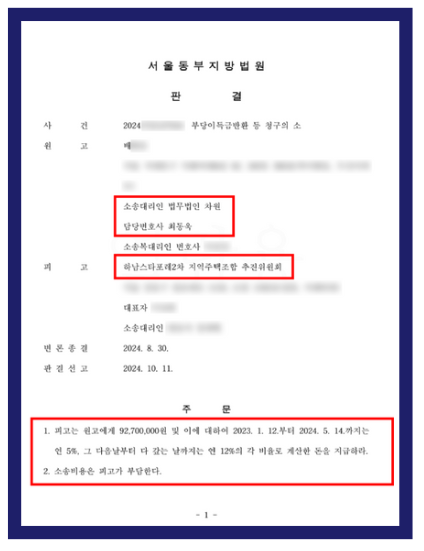 그 결과, 서울동부지방법원은 하남스타포레2차 지역주택조합에 대해 의뢰인에게 원금 9,270만 원 전액과 이에 대한 지연이자를 반환하라는 승소 판결을 내렸습니다.