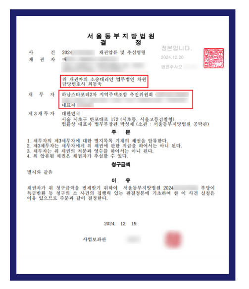 이에 최동욱 변호사는 승소 판결을 바탕으로 하남스타포레2차 지역주택조합의 재산에 대해 강제집행을 진행하였고, 그 결과 의뢰인께서는 2025년 1월 9일에 원금 9,270만 원 전액과 이자 1,300만 원을 포함한 총 1억 570만 원을 실제로 회수하셨습니다.