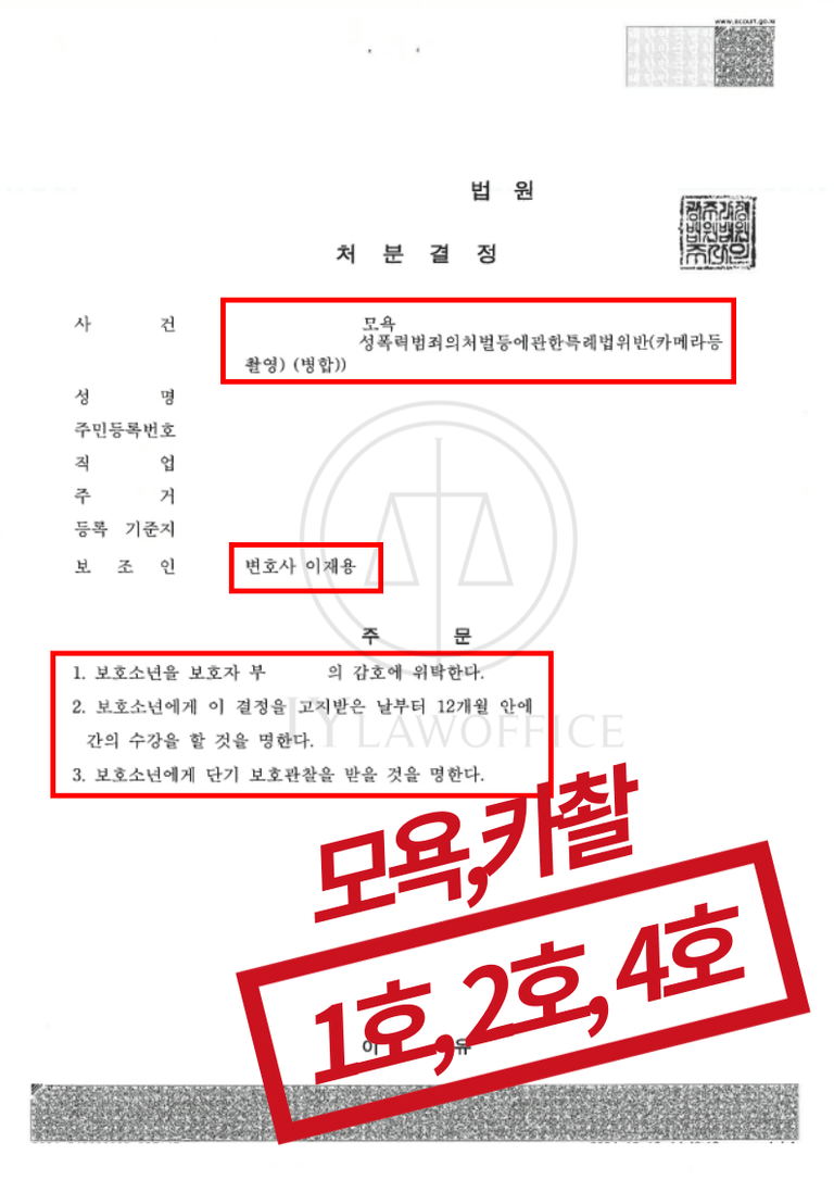 [소년법 전문 변호사 성공사례] 소년범죄 모욕,카촬 - 소년보호처분 1호,2호,4호 처분