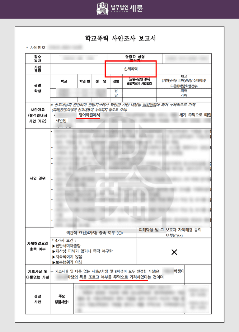 정확한 사실관계 파악을 위해 영어학원 원장의 진술도 확보되었습니다. 원장은 직접 보지는 못했으나 관련 학생들과 상담하여 확인한 내용이라며 진술했습니다. 해당 사례의 경우 상해와 관련된 진단서가 따로 제출되지는 않았으나, 관련 학생과 목격자의 진술에 따라 신체폭력이 이루어졌다고 판단하여 학폭이 인정되었던 사안이었습니다.