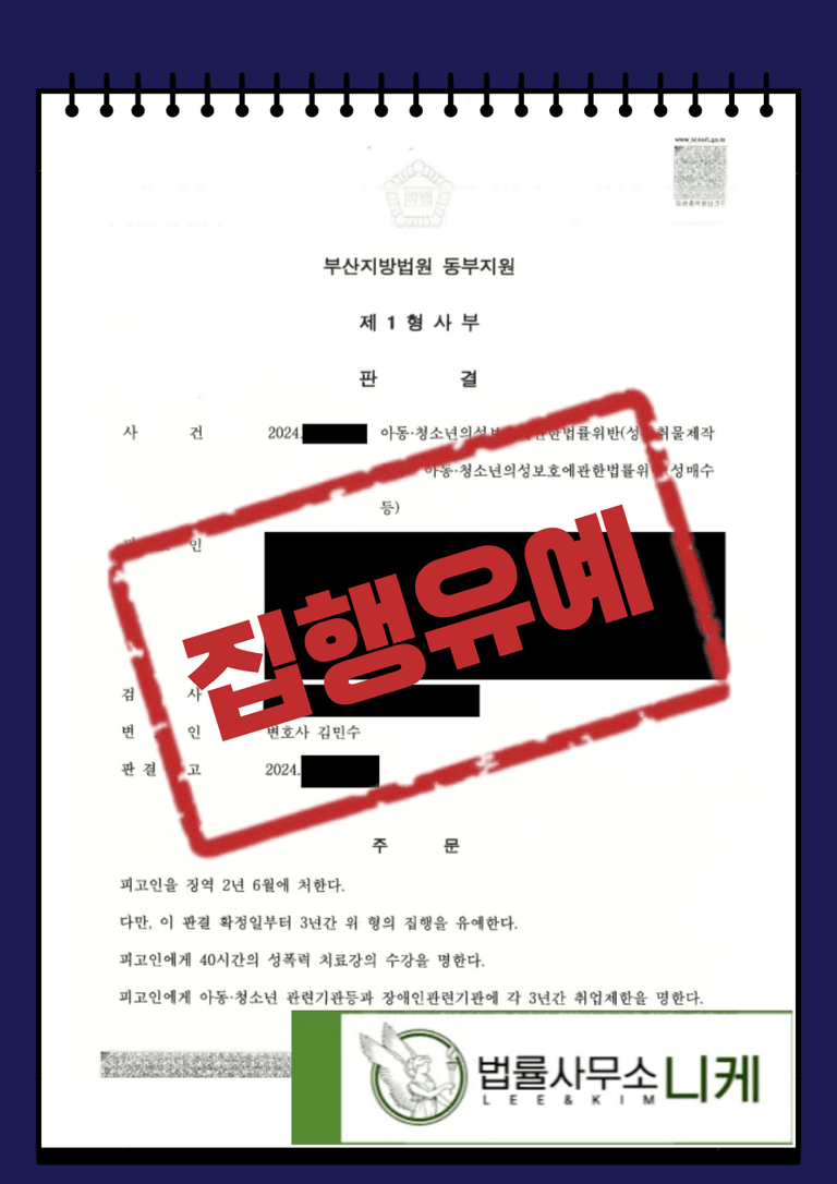 그 결과 의뢰인은 아동청소년의성보호에관한법률위반(성착취물제작 및 성매수) 혐의를 받고 법정형으로 최소 벌금형 최대 징역형을 선고받을 수 있었음에도 불구하고 집행유예를 받을 수 있었습니다.
