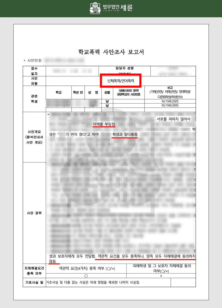 이를 위해 세륜 학폭전담변호사를 비롯한 학폭위 심의위원들은 사안조사 보고서, 학생 확인서, 보호자 확인서 등 각종 서류들을 꼼꼼하게 검토해 보았는데요. 두 학생과 목격 학생의 진술까지 모두 확인했습니다. 그리고 해당 사례는 신체폭력 사안이었기 때문에, 그 폭행 수준과 상해와 관련된 진단서가 따로 제출되지는 않은 점 역시 고려하였는데요.