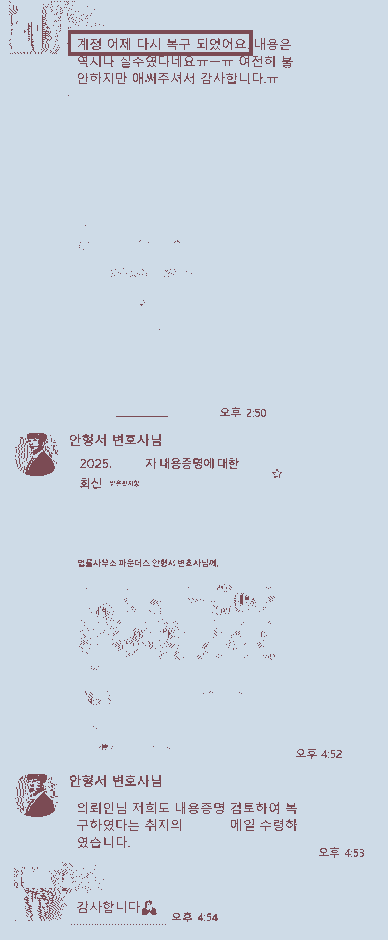 의뢰인이 수십번의 메일을 보냈음에도 불구하고 어떠한 조치가 이루어지지 않았던 때와 달리 변호인 명의 내용증명 발송 이후 비활성화된 계정에 대한 재검토가 이루어졌고 결과적으로 원만히 복구되어 계정 활동을 이어갈 수 있게 되었습니다.