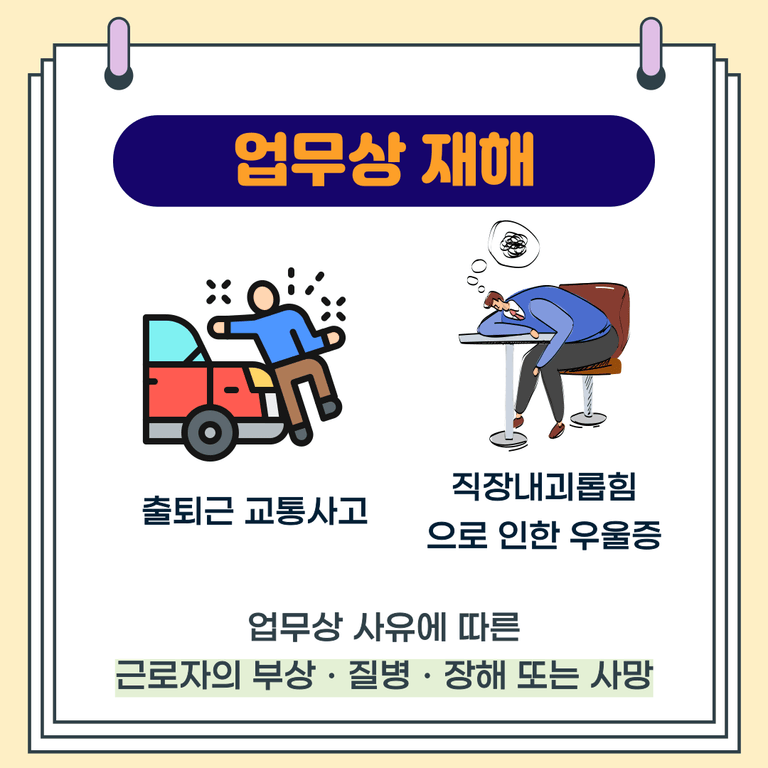 산재법상 업무상 재해란, 업무상 사유에 따른 근로자의 부상ㆍ질병ㆍ장해 또는 사망을 말합니다.