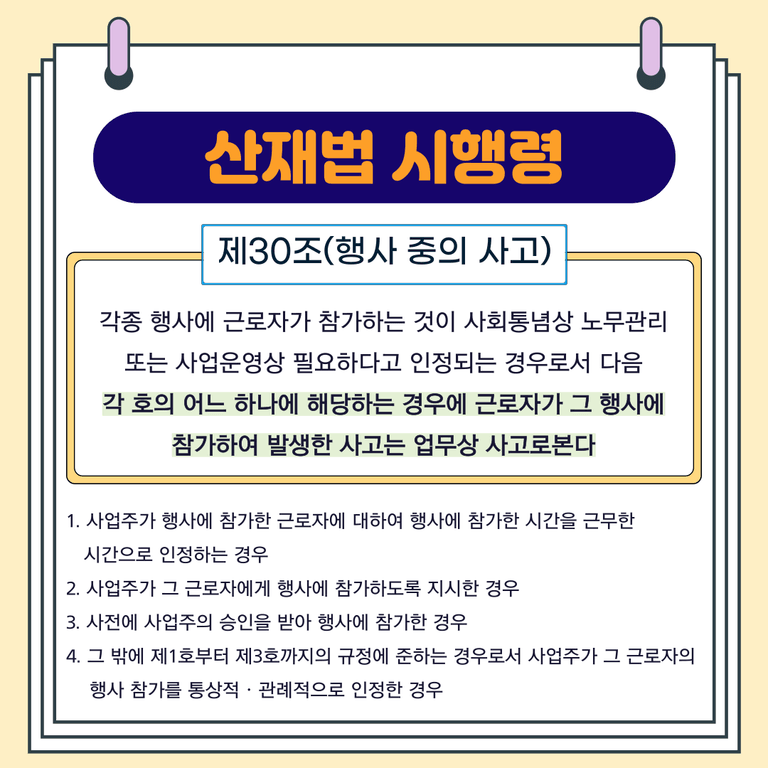 산업재해보상보험법 시행령 제30조에 따라, 각종 행사에 근로자가 참가하는 것이 사회통념상 노무관리 또는 사업운영상 필요하다고 인정되는 경우로서 다음 각 호의 어느 하나에 해당하는 경우에 근로자가 그 행사에 참가하여 발생한 사고는 업무상 사고로 봅니다.