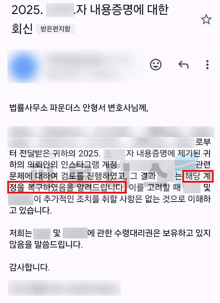 의뢰인이 수십번의 메일을 보냈음에도 불구하고 어떠한 조치가 이루어지지 않았던 때와 달리 변호인 명의 내용증명 발송 이후 비활성화된 계정에 대한 재검토가 이루어졌고 결과적으로 원만히 복구되어 계정 활동을 이어갈 수 있게 되었습니다.