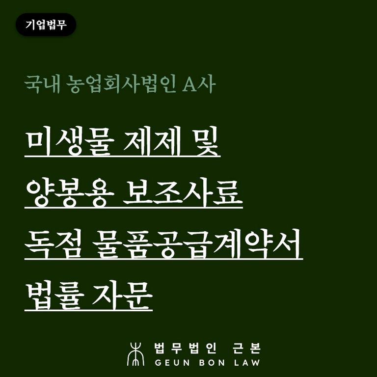 법무법인 근본은 국내 농업회사법인 A사가 미생물 제제, 복합비료, 양봉용 보조사료 등을 대상으로 독점 물품공급계약을 체결하는 과정에서 발생 가능한 법적 리스크를 검토하고, 명확한 권리 및 의무 관계 설정을 위한 종합적인 법률 자문을 수행하였습니다.