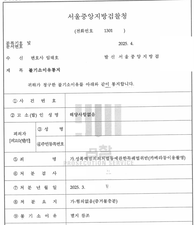 5. A씨는 카메라촬영죄 사건에서 저희의 조력을 받음으로써 검찰단계에서 불기소(혐의없음) 처분을 받으셨습니다.