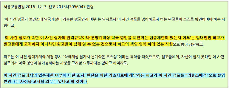 ‘상가의 관리규약이나 분양계약상 특정 업종, 예를 들어 약국 영업을 제한하는 약정이 있는지 여부’는 임차인들이 쉽게 알 수 없는 정보다. 따라서 이러한 사항은 임대인이 알려줘야 한다는 것이 판례의 입장이다.