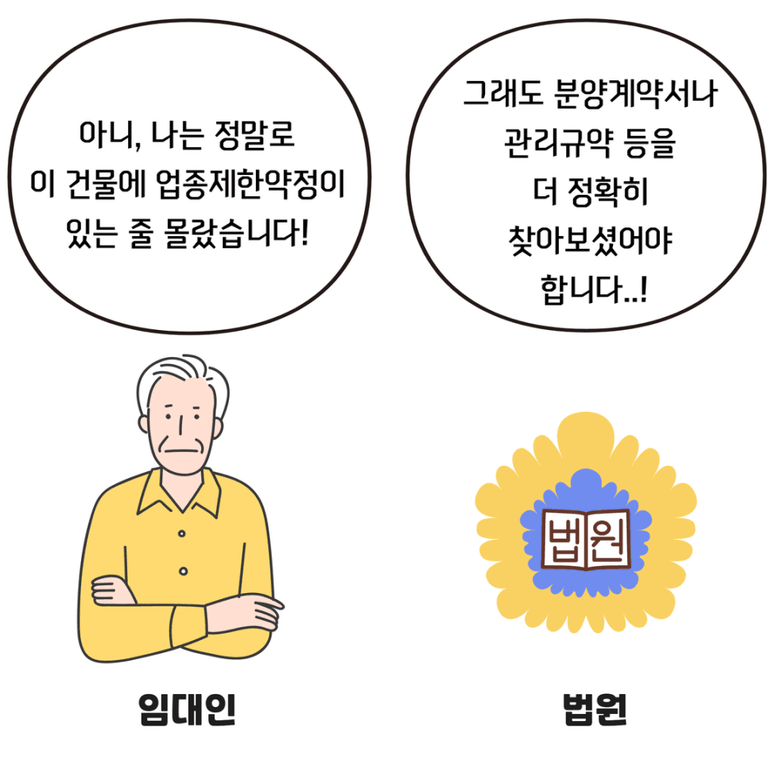 따라서, 만약 임대인이 실제로 상가건물에 업종제한 약정이 있는지 몰랐고, 관리규약에도 그러한 내용이 없다고 해도, 임대인이 해당 점포를 분양받을 때 업종을 지정해 분양받았다는 사실을 임차인에게 알리지 않았다면, 여전히 임대인의 "실수"가 인정될 수 있다.