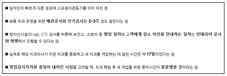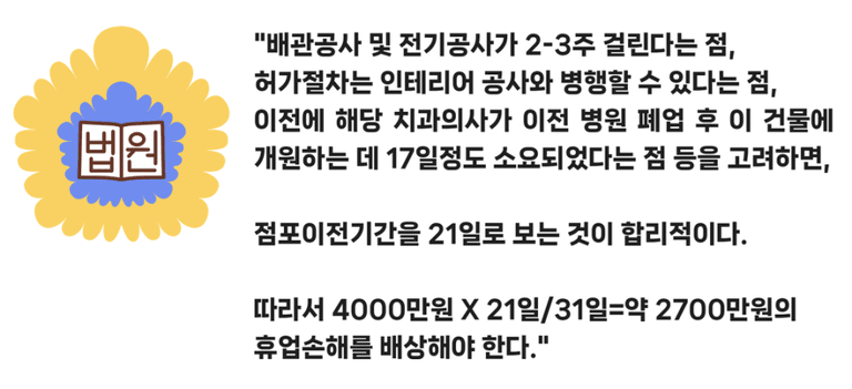 실제로 위의 사정을 토대로, 법원은 상가에서 치과를 폐원하고 새 장소에서 다시 개원하는 데 합리적으로 필요한 기간을 약 3주(21일) 정도로 판단하였다(서울고등법원 2021. 10. 1. 선고 2020나2022481 판결).