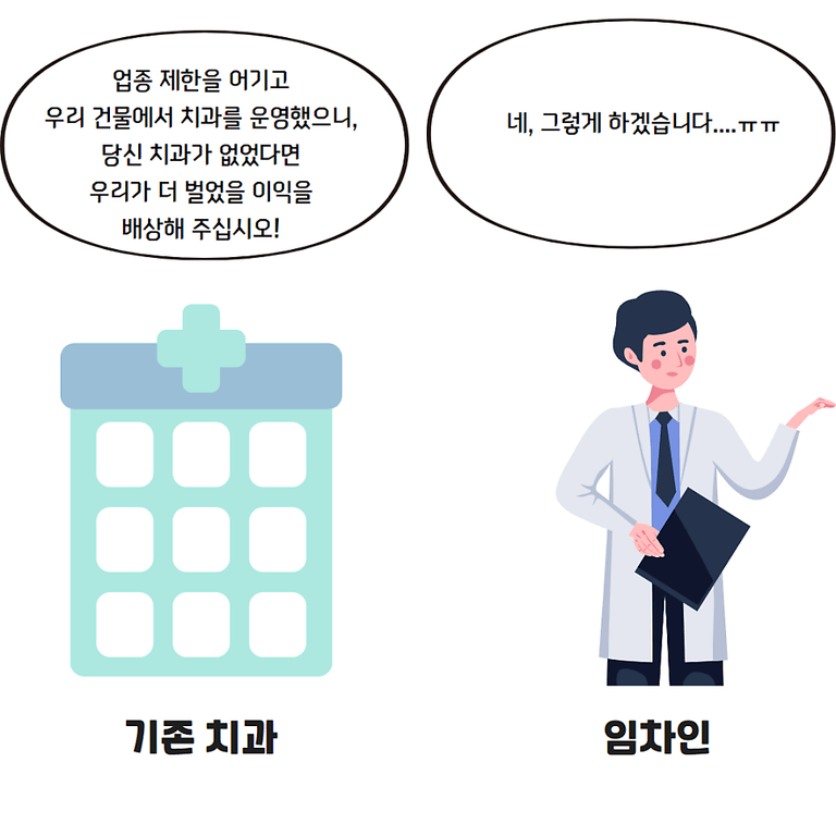 본 포스팅에서는 이해를 돕기 위해 치과와 약국을 예시로 들었으나, 영업금지청구소송에서 패소한 후 임대인에게 손해배상을 청구하는 위 방법은, 당연히 약국, 의원, 한의원, 치과, 카페, 학원, 태권도장, 베이커리, 음식점 등 모든 업종에 적용가능하다.
