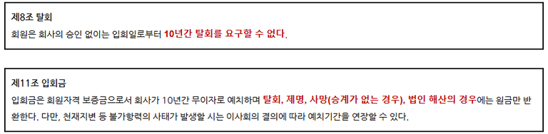 위 골프장 회칙 제8조에 따르면 회원은 입회일로부터 10년간 탈회할 수 없는데, 회칙 제11조에 따르면 회원이 탈회하는 경우에 입회금을 비로소 반환받을 수 있으므로, 결국 회원은 사실상 10년동안 입회금을 반환받을 수 없다는 이야기가 된다.