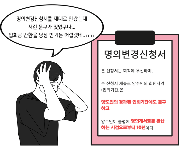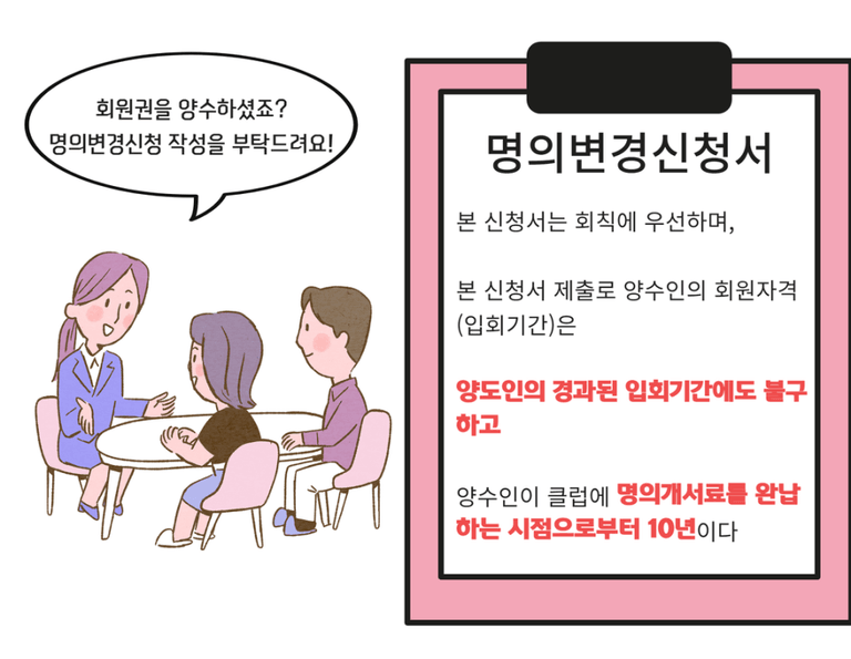 따라서 입회금을 빨리 돌려받고 싶거나, 아니면 회원 자격을 오래 유지하려는 목적에 따라, 명의변경신청서에 적힌 내용을 꼼꼼히 확인하는 것이 중요하다. 명의가 바뀌었을 때 입회금을 반환받을 수 있는 시점이 언제인지 미리 파악해야 하기 때문이다.