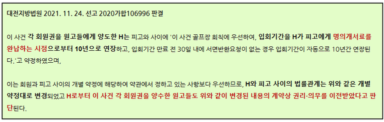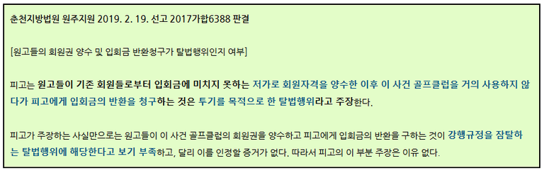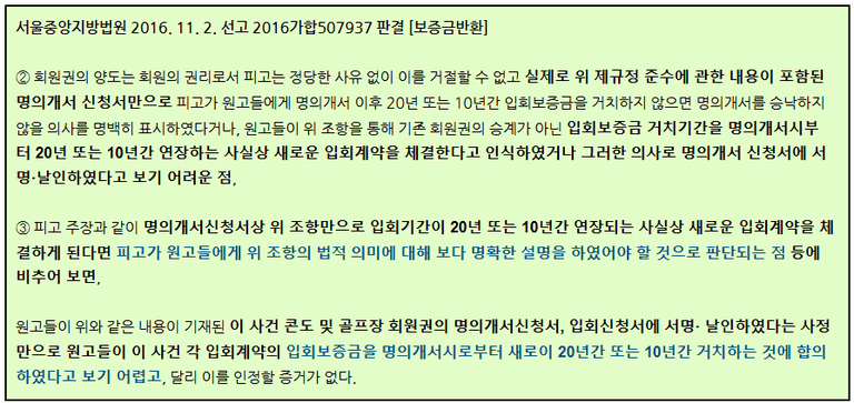 이러한 이유로 법원은 양수인이 골프클럽에 새로 가입한 것이 아니라, 기존 회원의 지위를 그대로 이어받았다고 판단하였다.