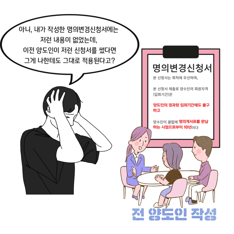 "본 신청서는 회칙에 우선하며, 본 신청서 제출로 양수인의 회원자격(입회기간)은 양도인의 경과된 입회기간에도 불구하고 양수인이 클럽에 명의개서료를 완납하는 시점으로부터 10년이다"