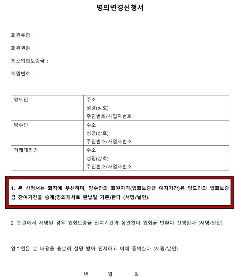 따라서 본인의 목적에 따라—즉, 입회금을 빨리 반환받고자 하는지, 아니면 장기간 회원 자격을 유지하려는지에 따라 — 명의변경신청서의 문구를 정확히 확인해야 할 필요가 있다.